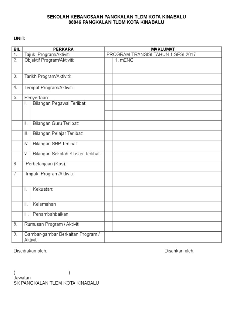 Laporan evaluasi hasil pelaksanaan program pembinaan guru dan kepala sekolah. Turut dijemput untuk menyaksikan pelancaran. Contoh penulisan laporan tahunan unit kokurikulum kadet remaja sekolah motto. Contoh laporan program kerja operator sekolah. Contoh laporan program unie onie.